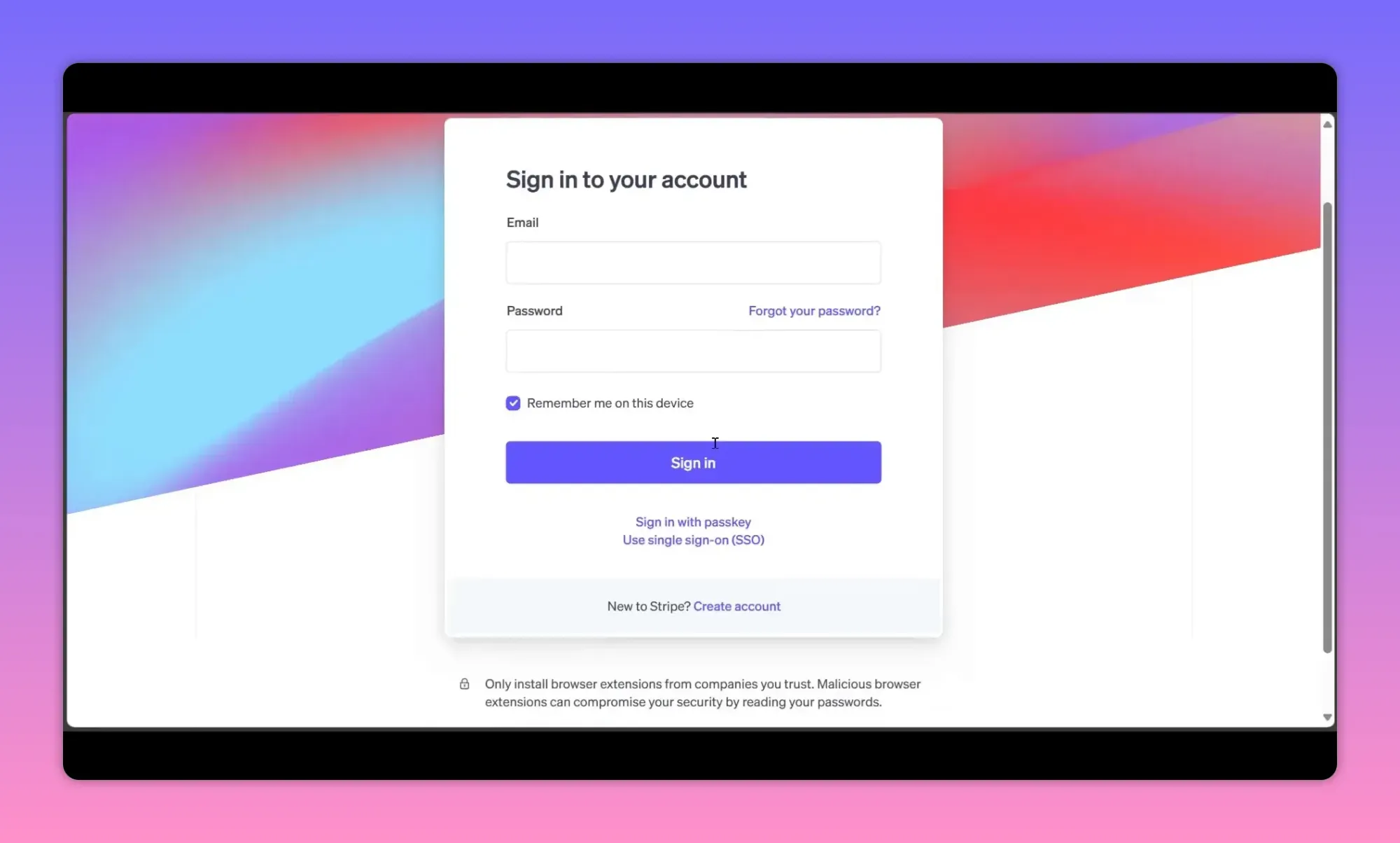 Go to stripe.com and sign up with an email, full name, and password. Stripe supports passkeys and single sign-on if you prefer those options.