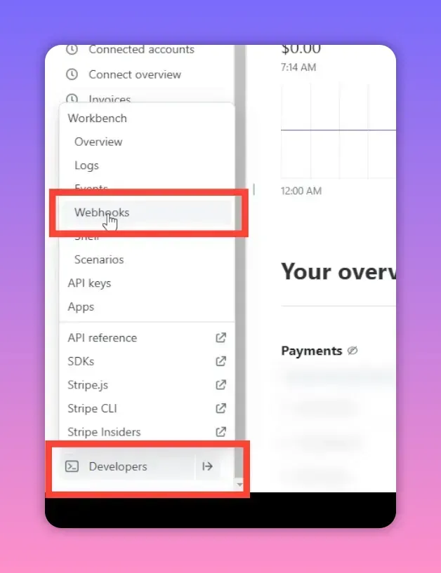- Open the Developers section and select Webhooks (or Endpoints / Destinations depending on UI).